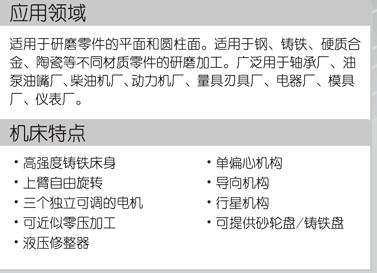 機(jī)床備有液壓修整器、單偏心機(jī)構(gòu)、導(dǎo)向機(jī)構(gòu)和行星機(jī)構(gòu)。根據(jù)特殊訂貨要求可供應(yīng)砂輪盤。