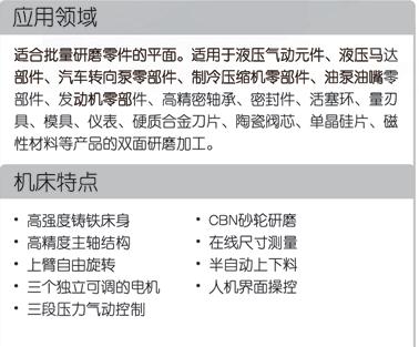 本機床為自動、高效率機床,適用于批量研磨零件。主要用于研磨零件的平面,適用于鋼、鑄鐵、銅、硬質(zhì)合金、陶瓷、單晶硅等的加工。可以廣泛用于液壓氣動元件、液壓馬達部件、汽車燃油泵部件、制冷壓縮機零部件、油泵油嘴零部件、發(fā)動機零部件、高精密軸承滾柱及套圈、密封件、活塞環(huán)、量刃具、模具、儀表、硬質(zhì)合金刀片、陶瓷閥芯、磁性材料等產(chǎn)品的雙面研磨加工。